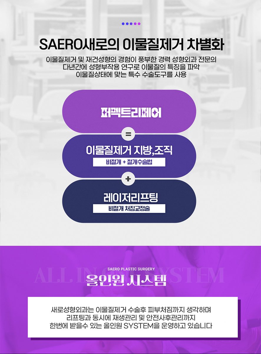 또한 새로성형외과는 환자분들의 맞춤 상담 , 그에 맞는 수술법 / 치료법을 진행해 안전하게 제거수술을 진행하고 있습니다.