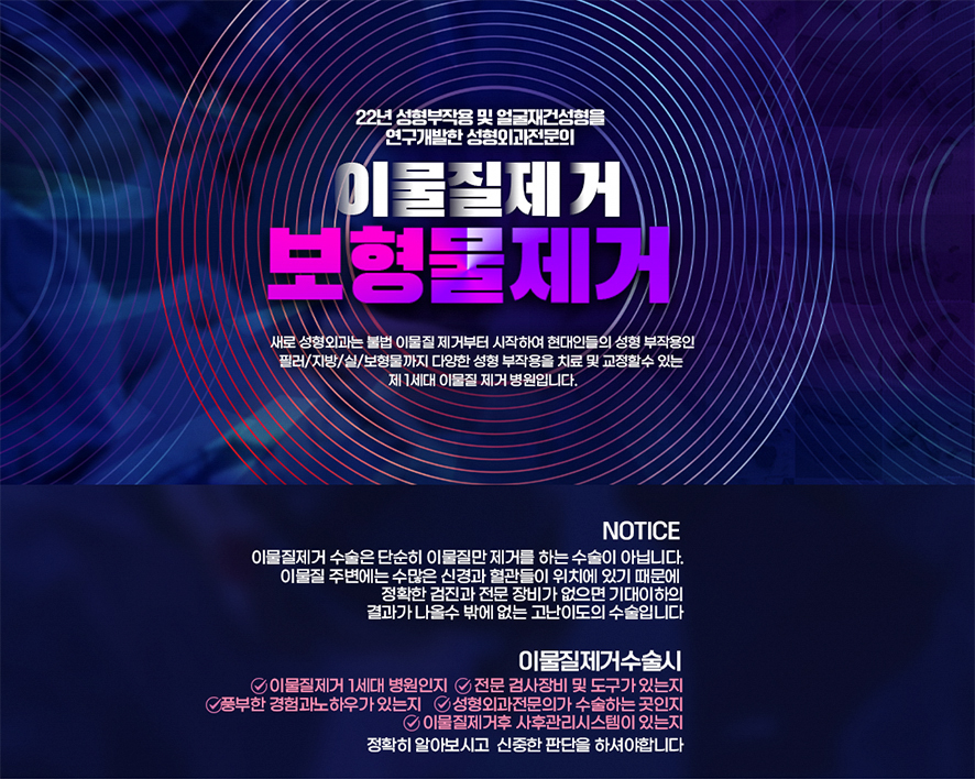 새로성형외과 이물질제거 차별화 이물질제거 및 재건성형의 경험이 풍부한 22년 경력 성형외과 전문의의 다년간에 성형부작용 연구로 이물질의 특징을 파악하고 이물질 상태에 맞는 특수 수술도구를 사용하여 수술을 진행합니다.