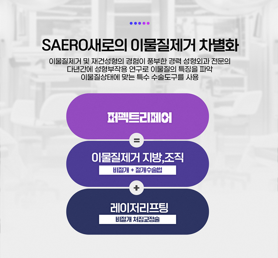 새로성형외과는 이물질제거 수술 후 피부처짐까지 생각하며 리프팅과 동시에 재생관리 및 안전사후관리까지 한 번에 받을 수 있는 올인원 시스템을 운영하고 있어 흉터, 부작용에 대한 걱정은 하지 않으셔도 되겠습니다.