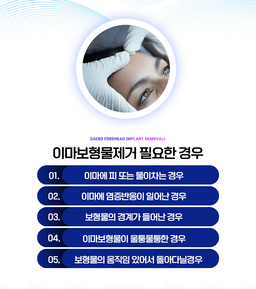 이마보형물 제거가 필요한 경우는 다양하지만 그중에서도 이마에 피 또는 물이 차는 경우, 이마에 염증반응이 일어난 경우, 보형물의 경계가 드러난 경우, 이마보형물이 울퉁불퉁한 경우, 보형물의 움직임이 있어서 돌아다닐 경우 이러한 경우가 해당이 되시는 부작용 호소인분들께서는 새로성형외과로 오셔서 정밀검진을 받아보시는 것이 좋겠습니다. 앞에서 말한 경우 외에도 자신에게 발생한 증상이 이마보형물 부작용으로 의심이 되신다면 최대한 빠른 시일 내에 병원에 내원하시는 것이 중요하겠습니다.